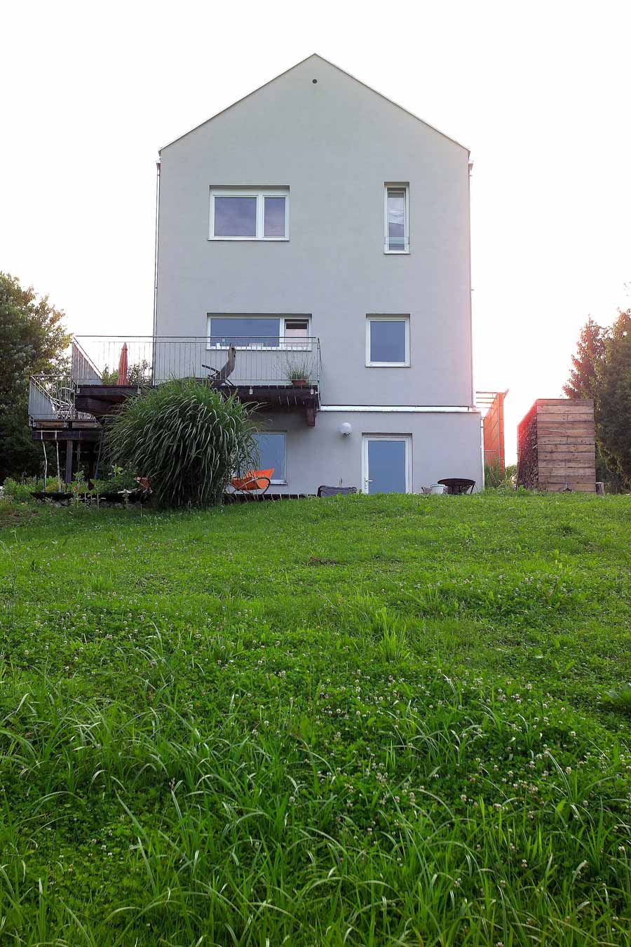 Die Westfassade ist gewissermaßen der Rücken des Hauses, gestaltet nur mit der unterteilten und verglasten Terrassentüre und dem Edelstahlkamin, der haarscharf an der Symmetrieachse vorbeigeht.